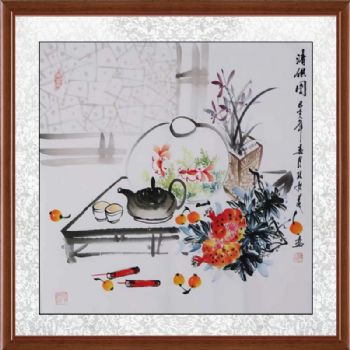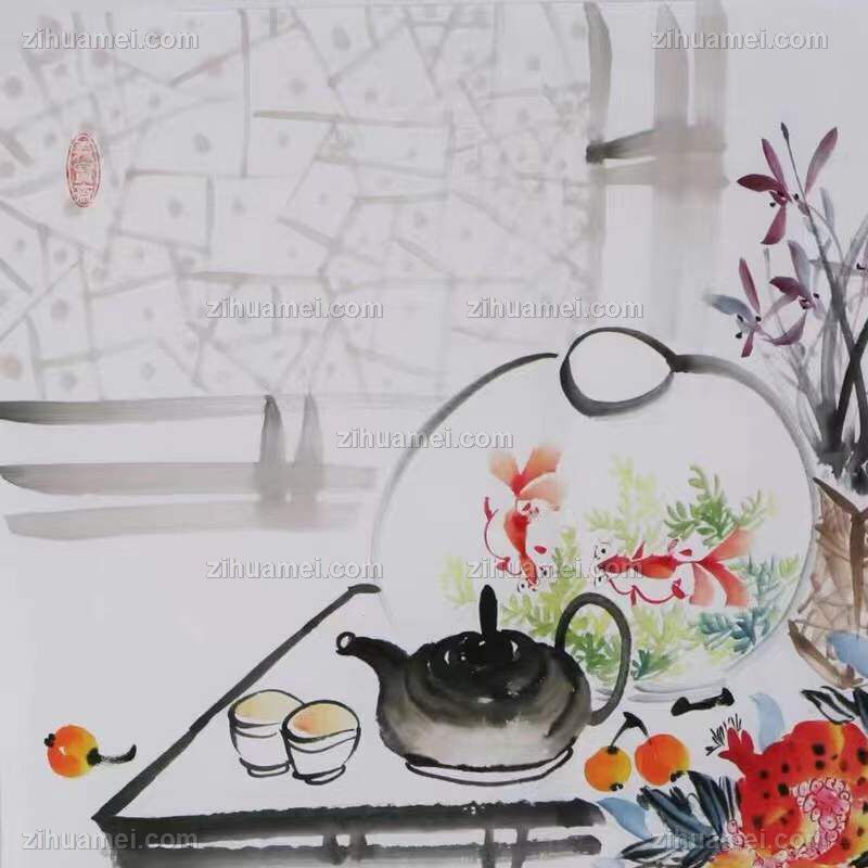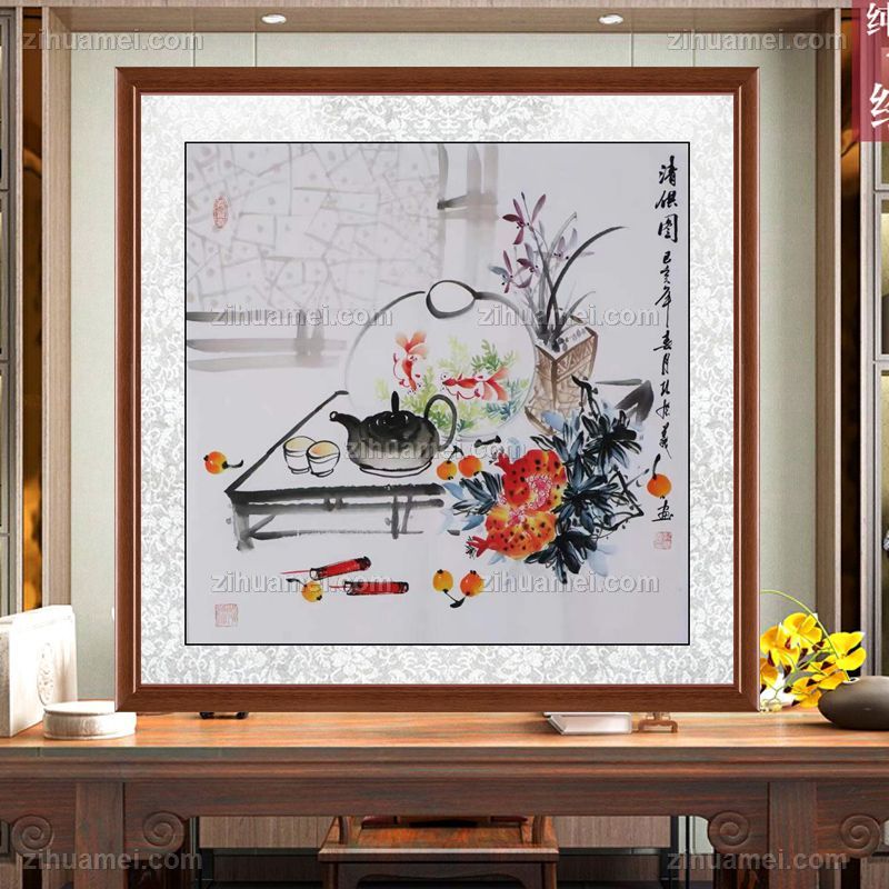 • 人生难得清闲一壶茶赏鱼游得自在手绘国画清供图孔庆义风格国画四尺斗方实木外框