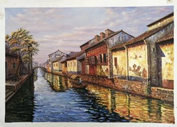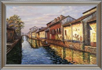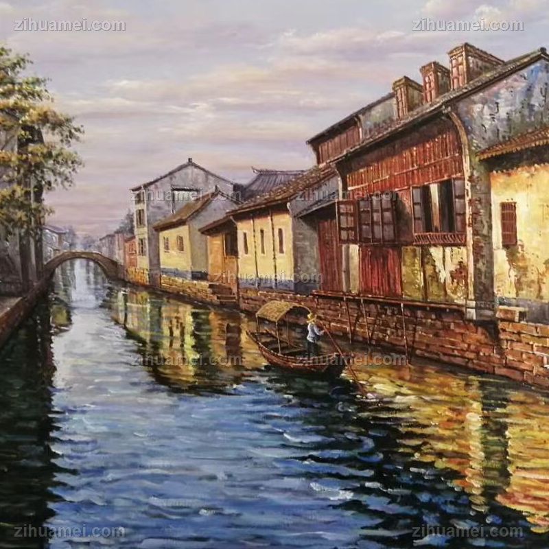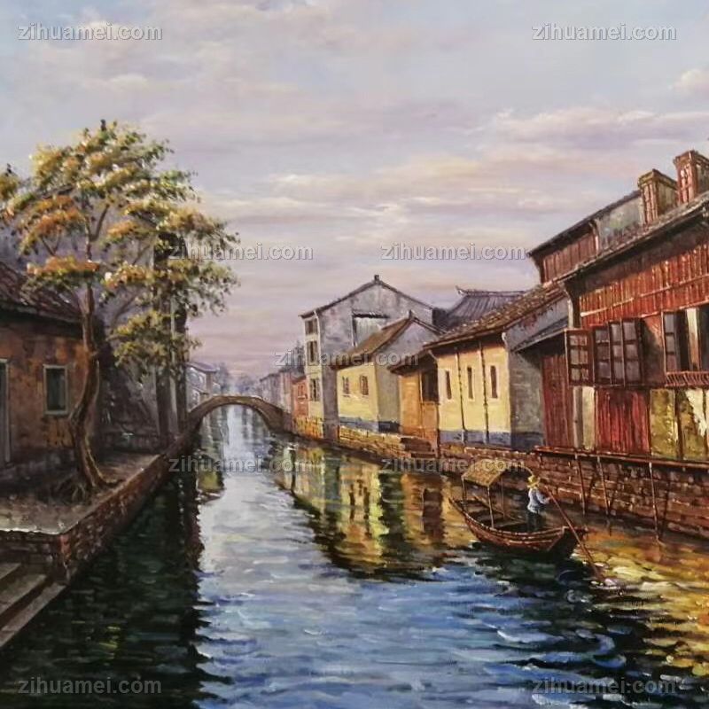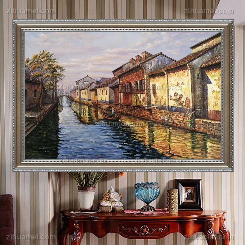 • 江南水乡小桥流水人家写意风景油画手绘油画实木画框客厅走廊挂画