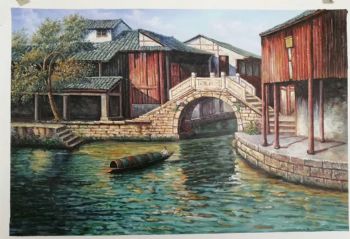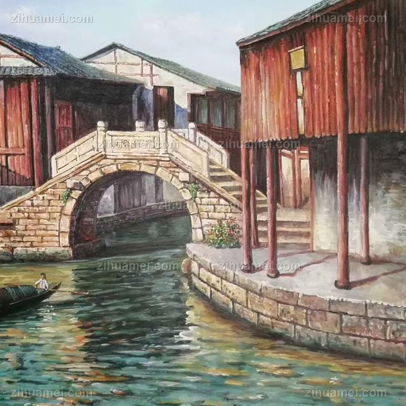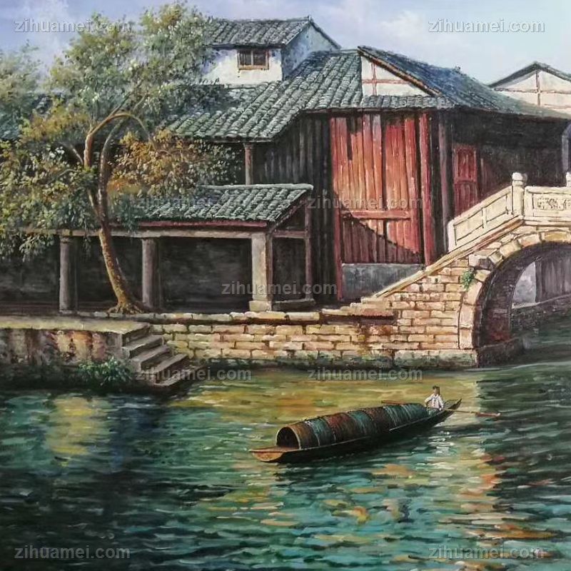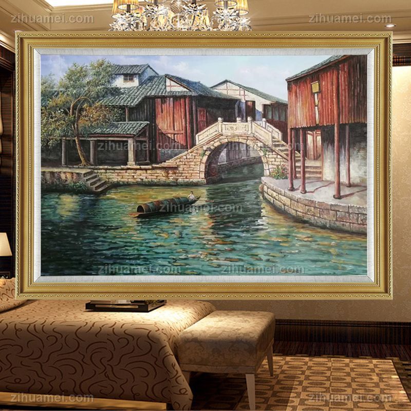 • 小桥流水人家客厅走廊挂画江南水乡写意风景油画手绘油画实木画框