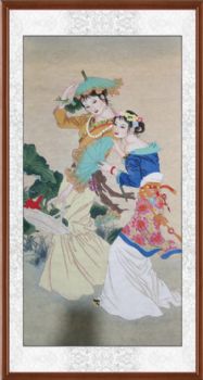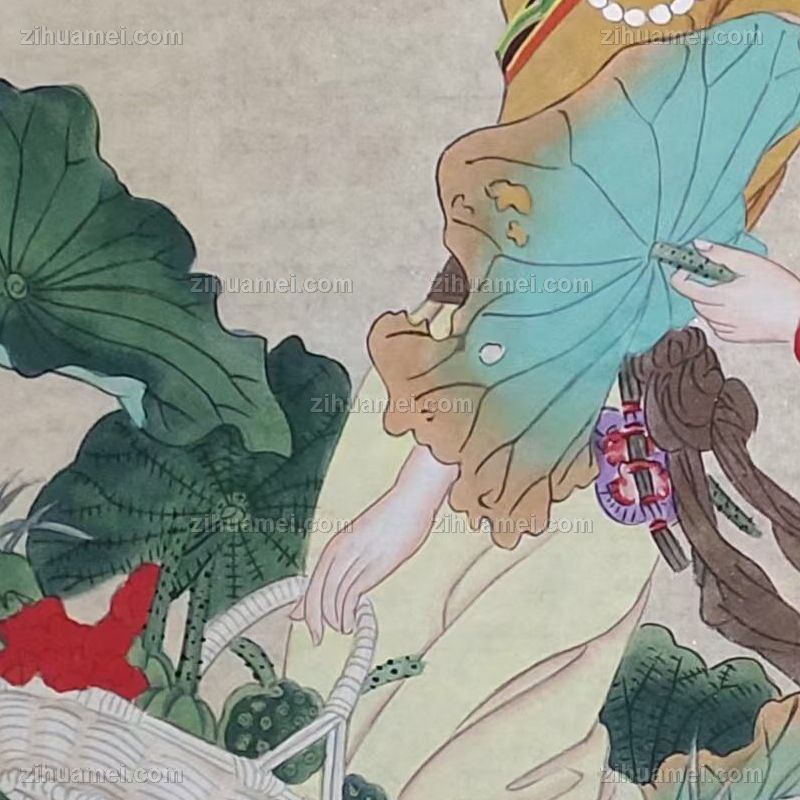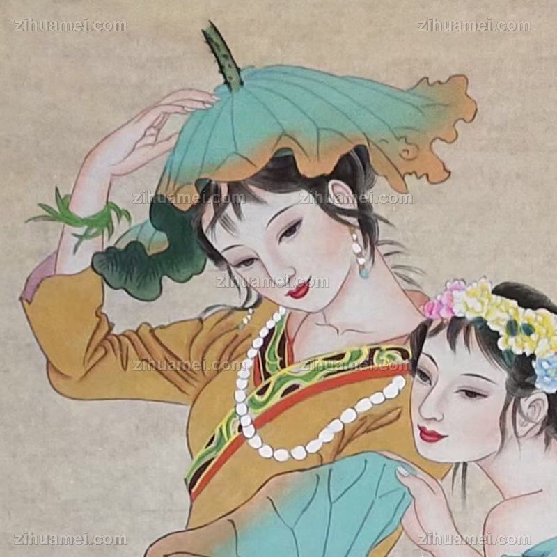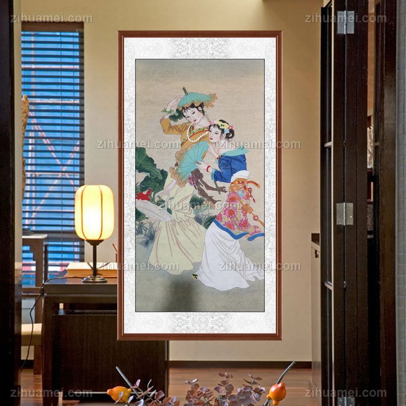 • 工笔人物画仕女图精品国画美女荷花嬉戏图实木画框
