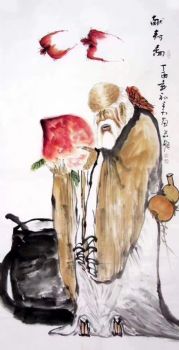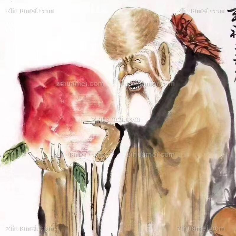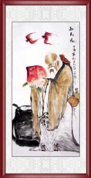 • 中国传统国画老寿星献寿图蝙蝠代表福气飞来手绘国画实木外框