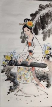 • 手绘菊花水墨写意人物国画芭蕉树下弹古筝美女写意画古代古装人物挂画