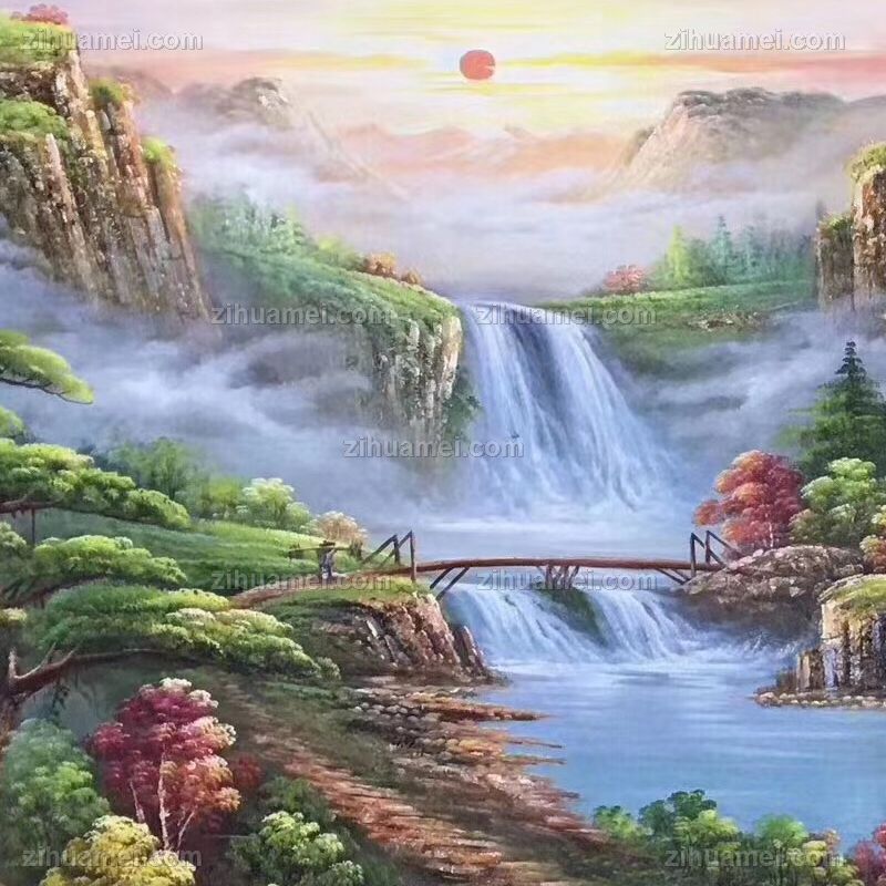 纯手绘风景油画山水画聚宝盆风景油画实木画框 手绘