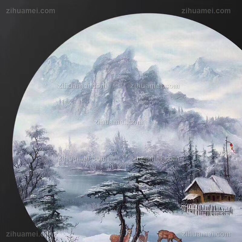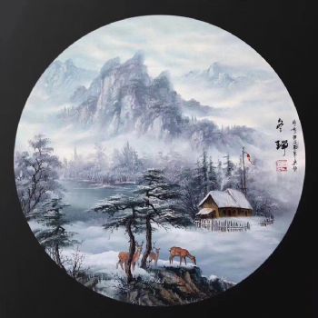• 冬瑞图纯手绘油画新中式油画圆形山水油画风景画春夏秋冬之冬瑞图