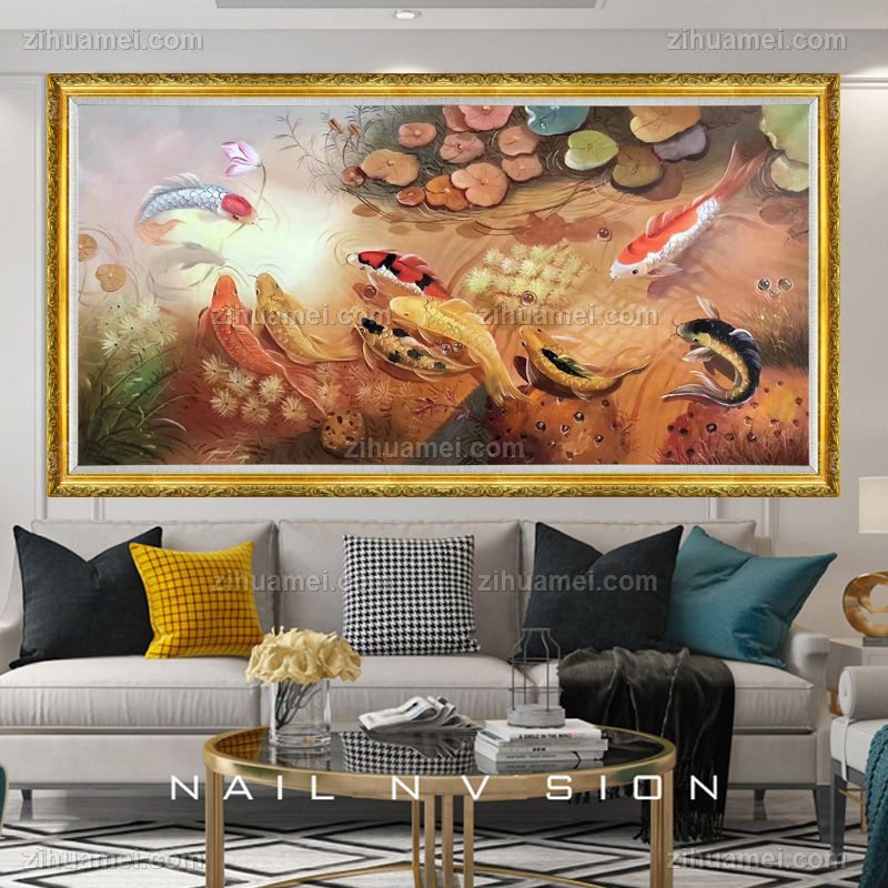 玄关九鱼图纯手绘写实锦鲤油画作品实木外框 手绘