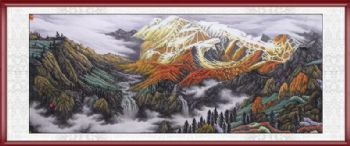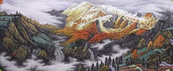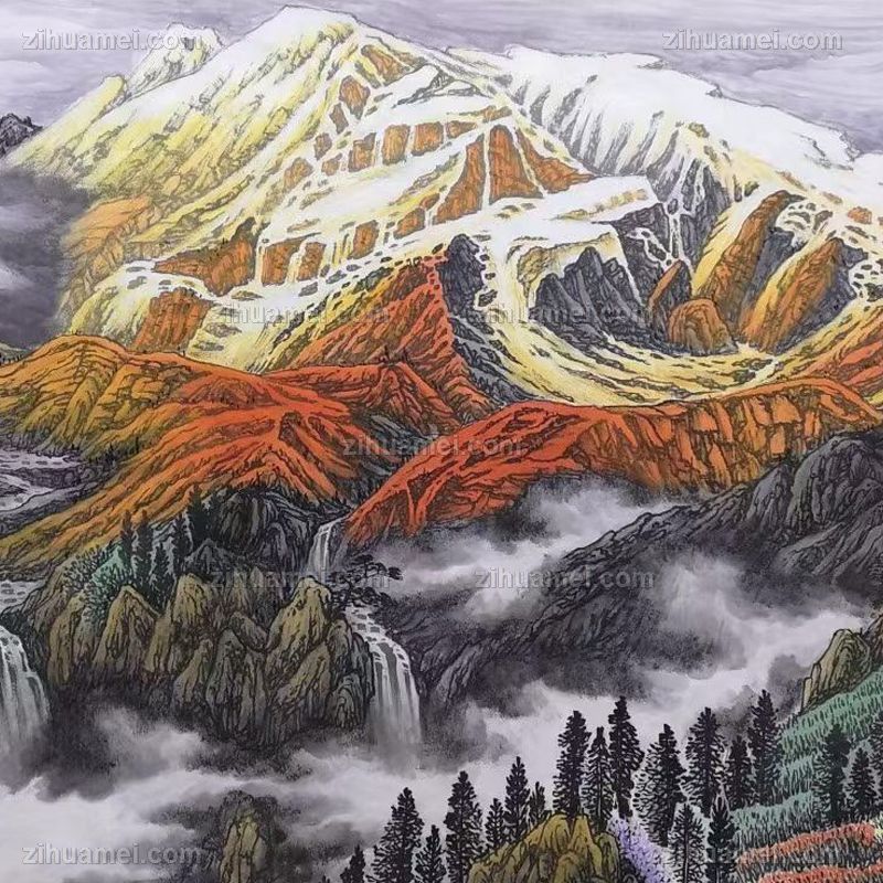 • 风景国画工笔国画山水画精品雪山小八尺国画纯手绘国画雪山下春意盎然支持个性提词