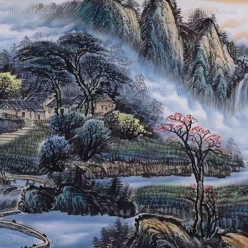 • 水墨山水画有人家有田地高品质小六尺手绘山水画中国国画实木画框接受个性提词