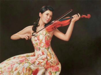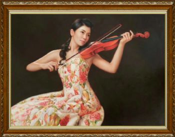 • 手绘人物油画新中式人物油画写实拉小提琴的美女油画人物艺术油画