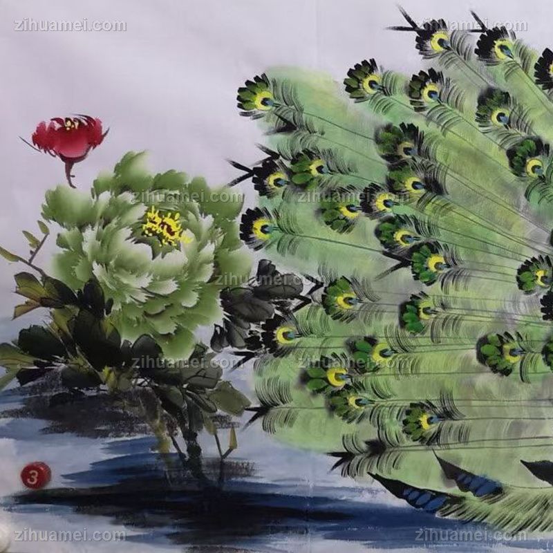 • 新中式手绘牡丹国画花鸟国画孔雀图装饰国画小六尺孔雀手绘国画
