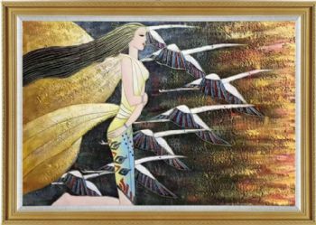 • 金色厚度肌理油画少女与大雁写意原创手绘民族风情手绘人物油画