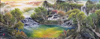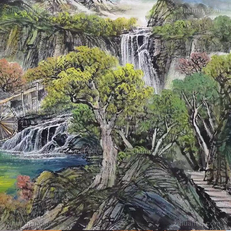 • 青绿格调山水画风车聚宝盆国画高品质纯手绘中式山水画小六尺国画山水支持个性提词