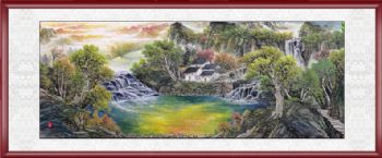 手绘 手工 国画 山水画聚宝盆 典雅红褐实木框 手绘