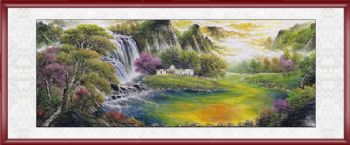 手绘 手工 国画 山水画聚宝盆 典雅红褐实木框 手绘