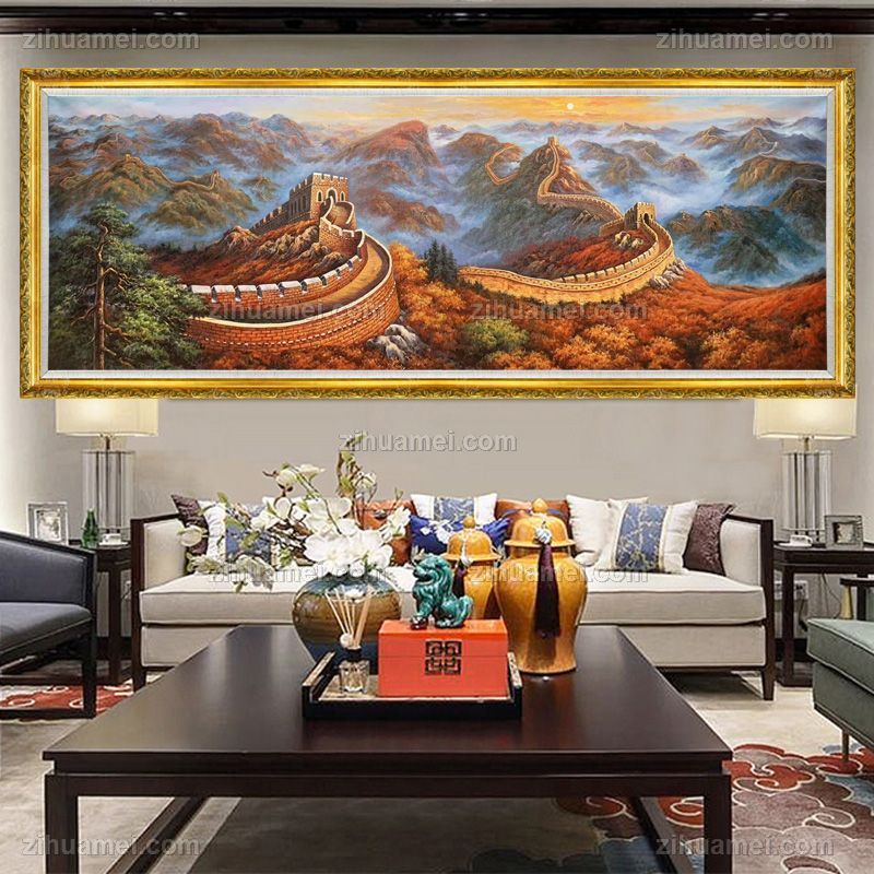 基业长青新中式手绘长城风景油画实木画框 手绘