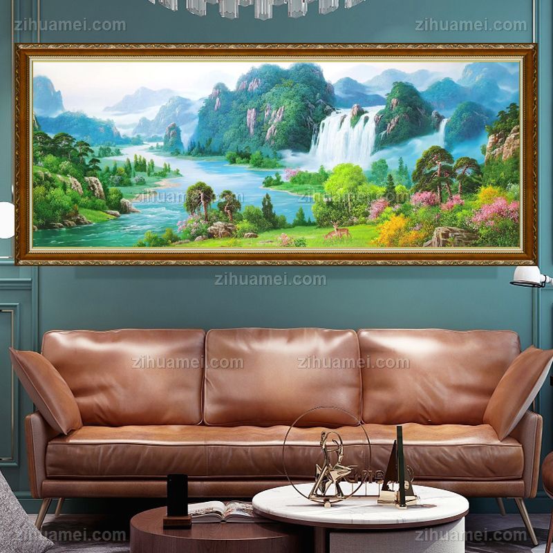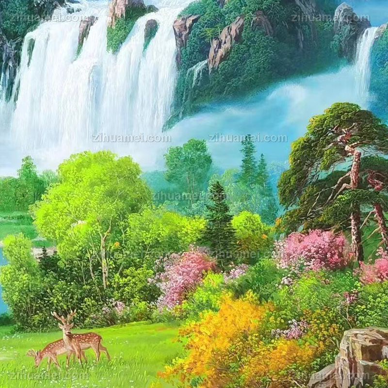 • 新中式油画精品手绘山水画鹿鹿吉祥青山绿水写实山水画油画风景画