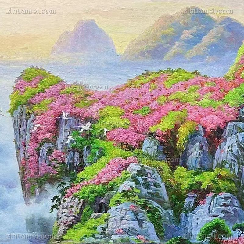 • 新中式青山绿水写实山水画精品手绘油画风景油画鹤舞升平风景画