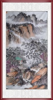 纯手绘彩墨四尺中式山水画工笔国画实木画框 手绘