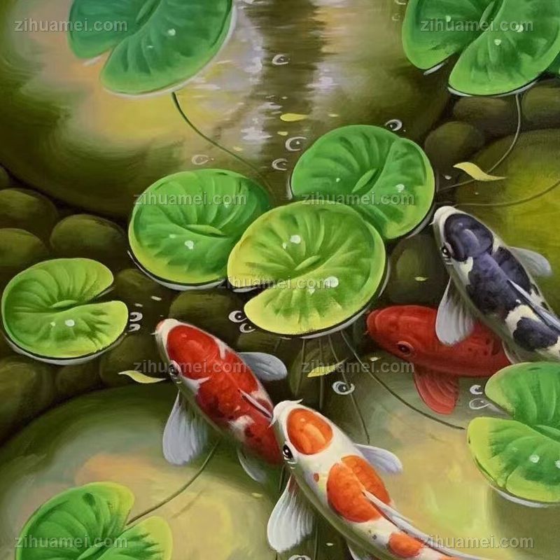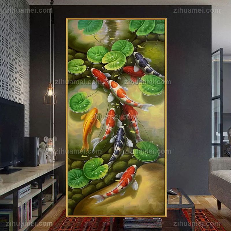 新中式年年有余锦鲤图纯手绘玄关荷花风景油画 手绘