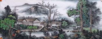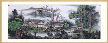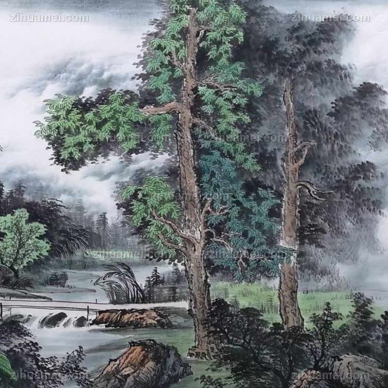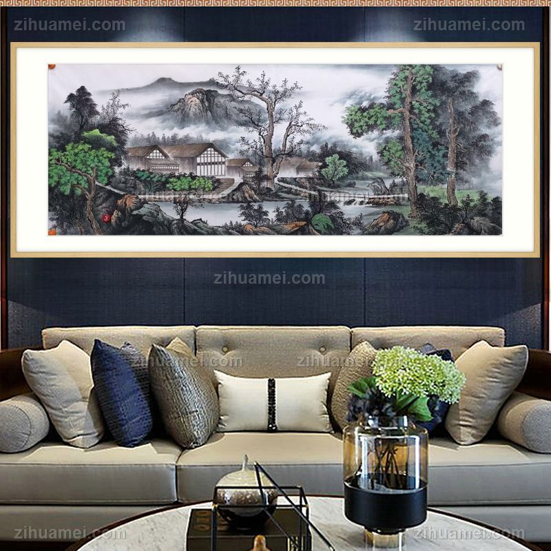 纯手绘彩墨四尺中式山水画工笔国画实木画框 手绘