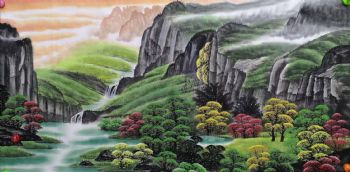 • 四尺纯手绘国画工笔画青绿色为主山水国画适合客厅挂画实木画框
