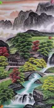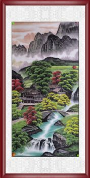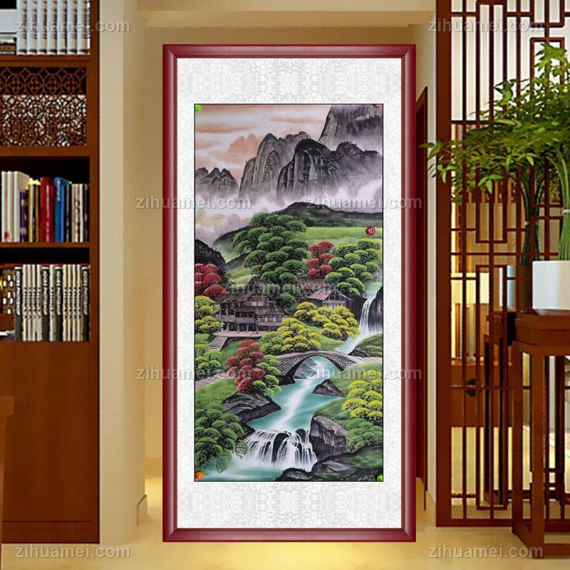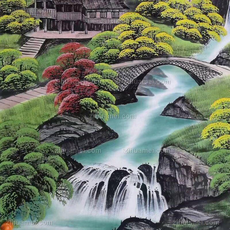 纯手绘彩墨四尺中式山水画工笔国画实木画框 手绘