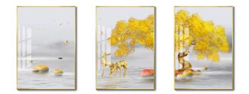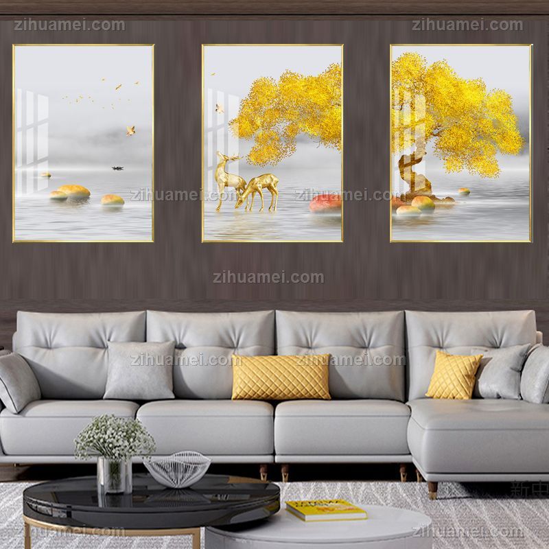 • 现代简约三联画一路发黄金岛高档轻奢晶瓷画铝合金框客厅样板房装饰画