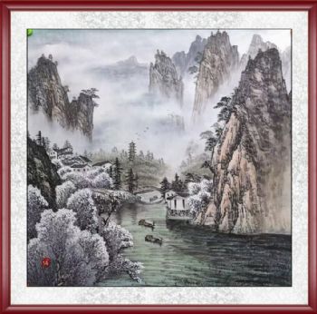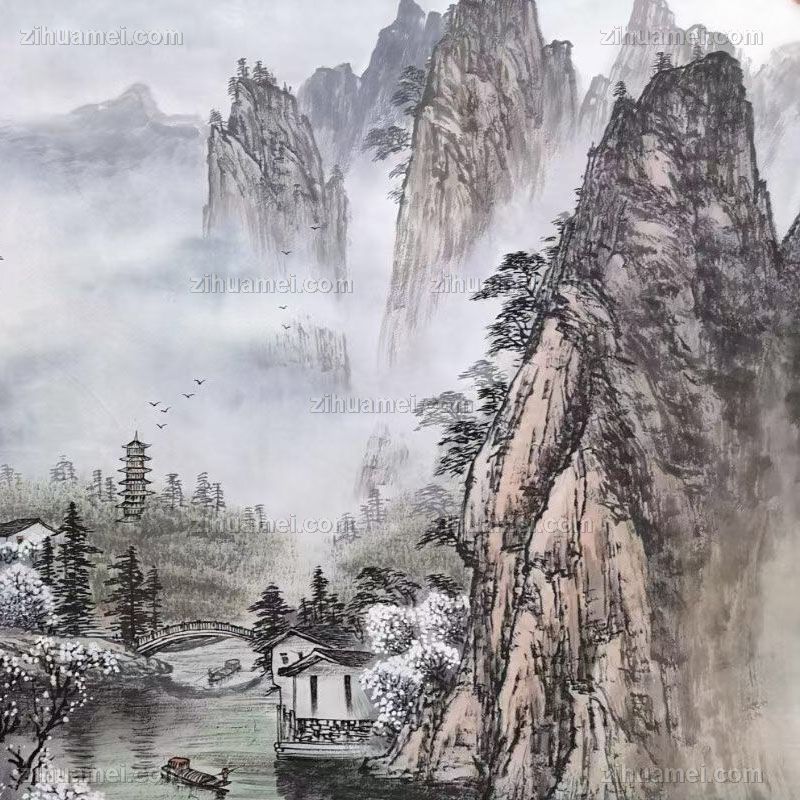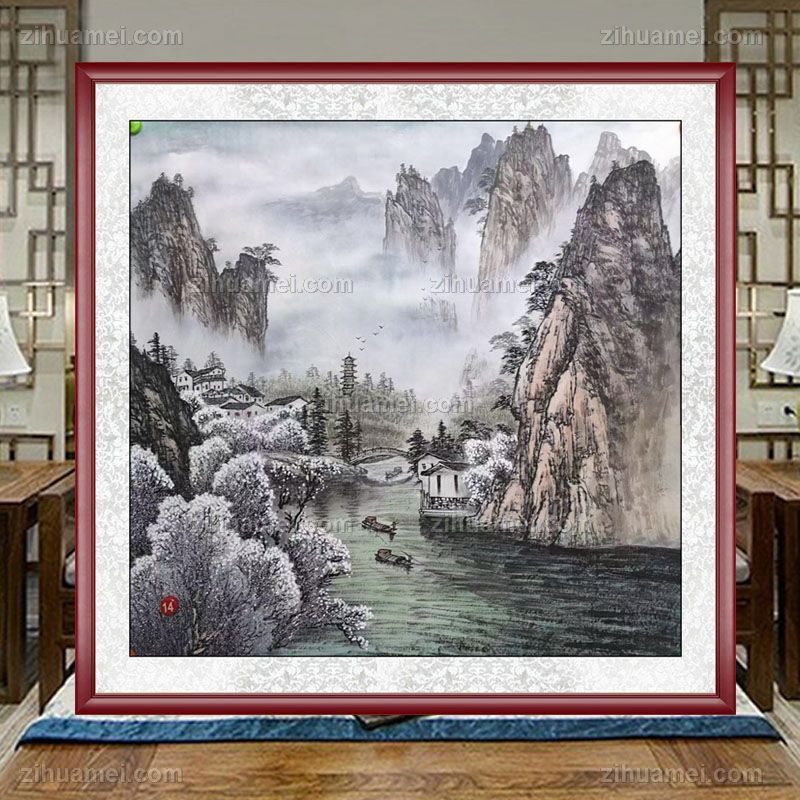 • 风水水墨山水国画六尺斗方纯手绘写意国画新中式山水画实木画框