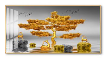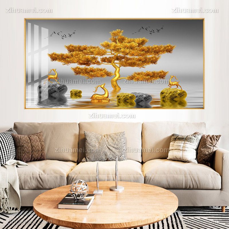 现代高清大型晶瓷画黄金树风水画新中式装饰样板房客厅装饰画 高清微喷