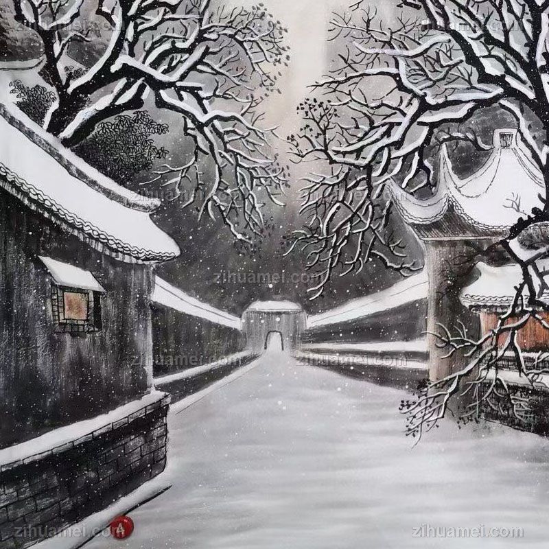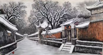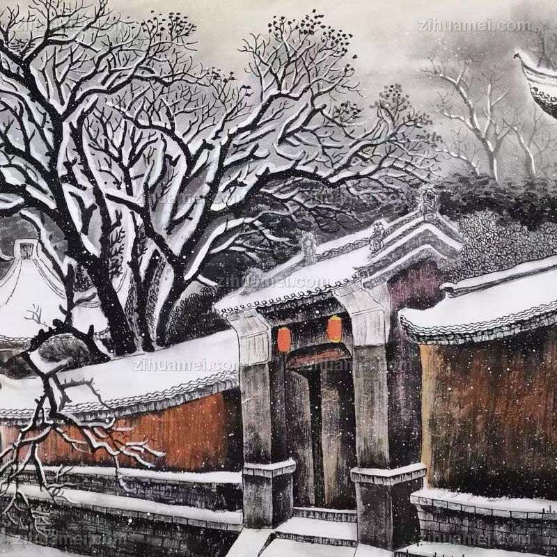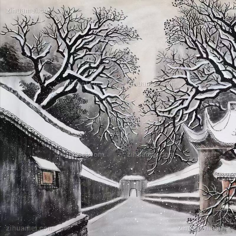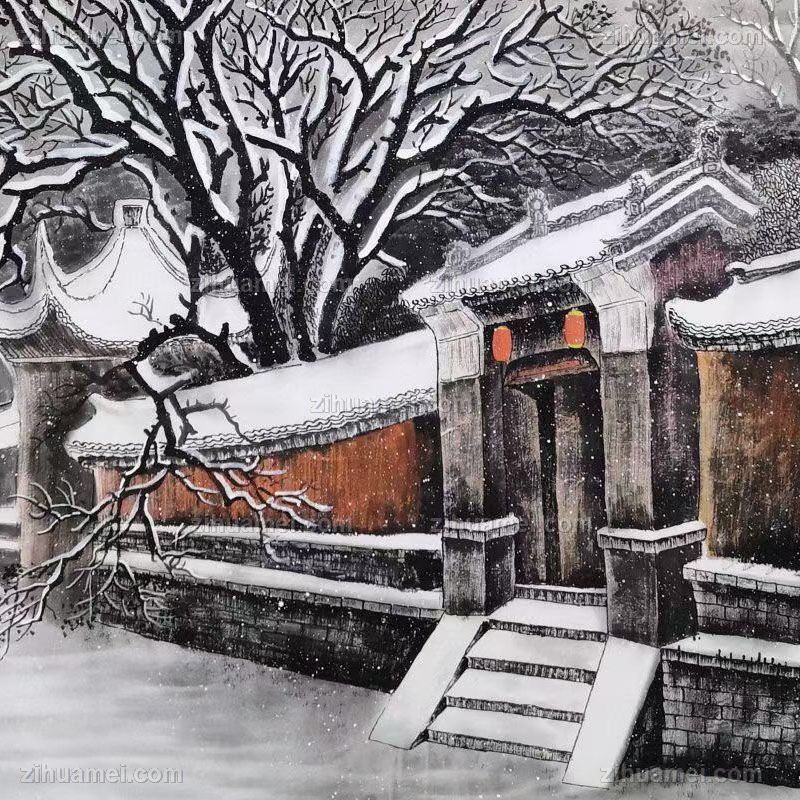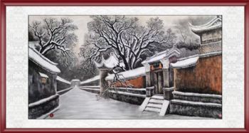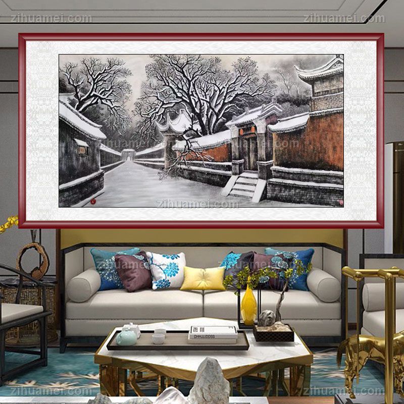 • 精品水墨画雪中的大户人家胡同精品大六尺纯手绘工笔风景画实木画框