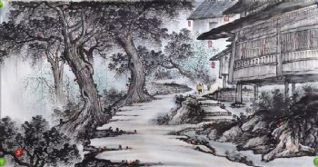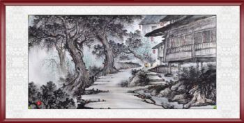 • 古朴木楼新中式老树风景画纯手绘风景画写意风景画实木画框