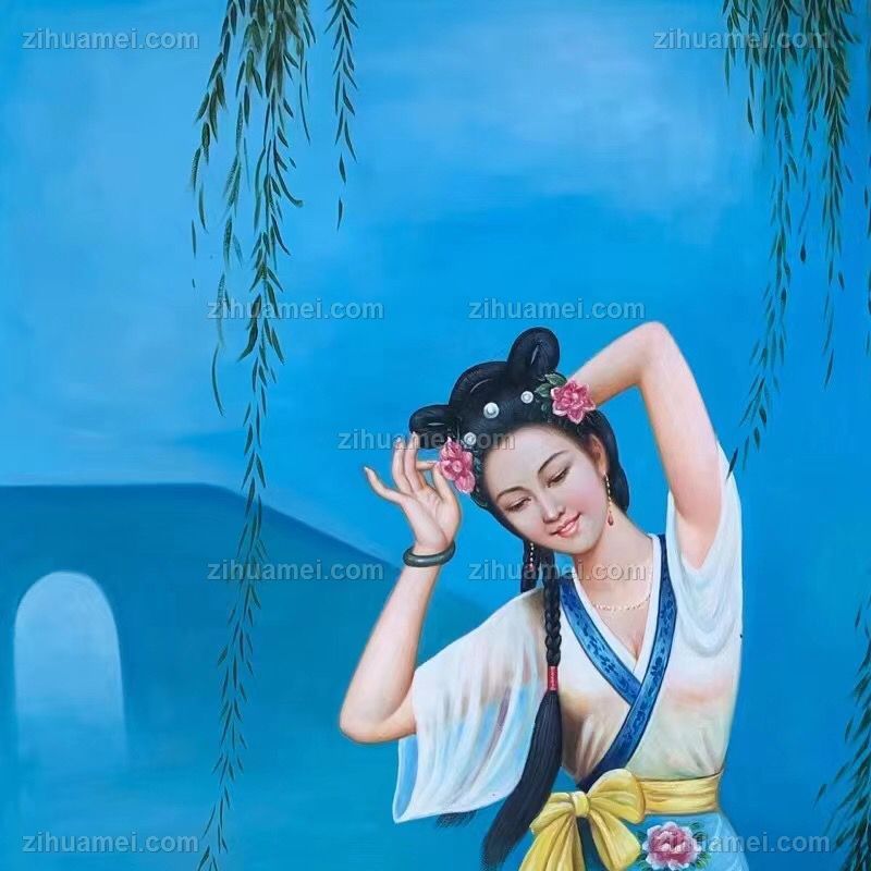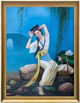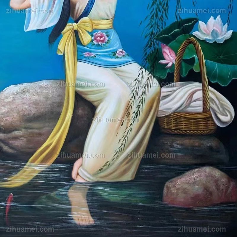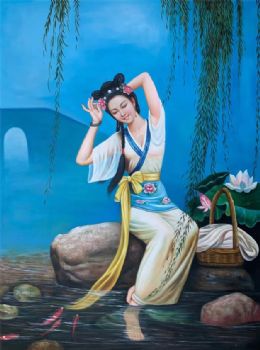 • 西施在河边浣纱中国古代四大美女纯手绘油画写实人物油画