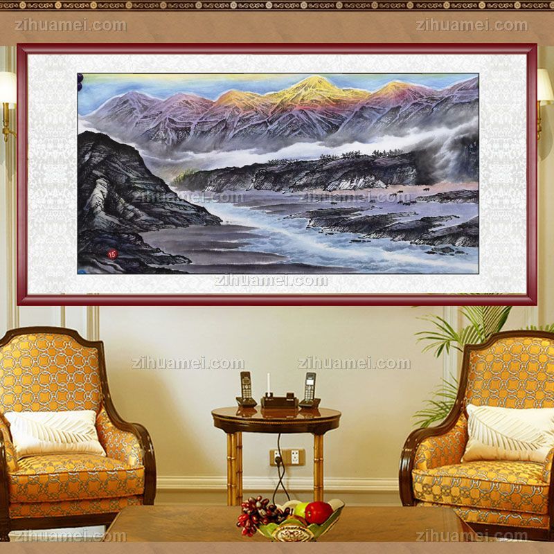 纯手绘彩墨四尺中式山水画工笔国画实木画框 手绘