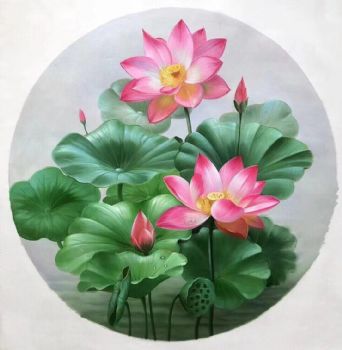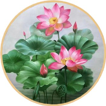 • 新中式荷花油画纯手绘油画寓意和和美美家庭和谐实木圆形外框