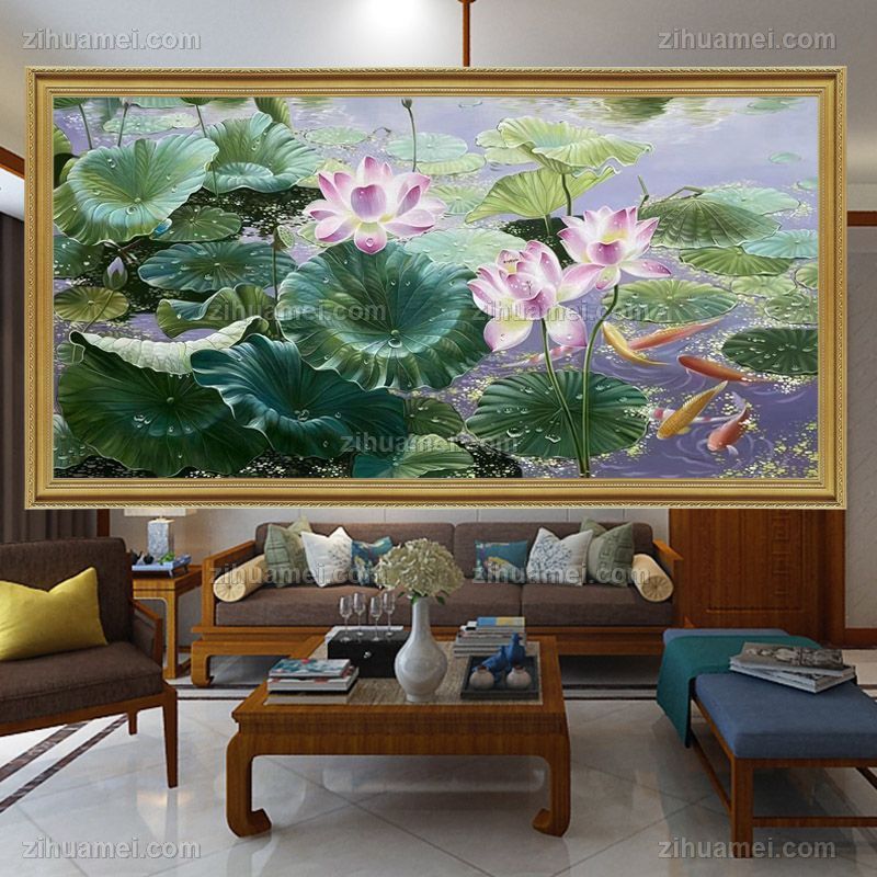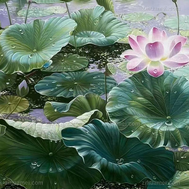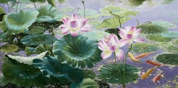 • 新中式风景油画荷花池写实油画和和美美连年有余纯手绘油画