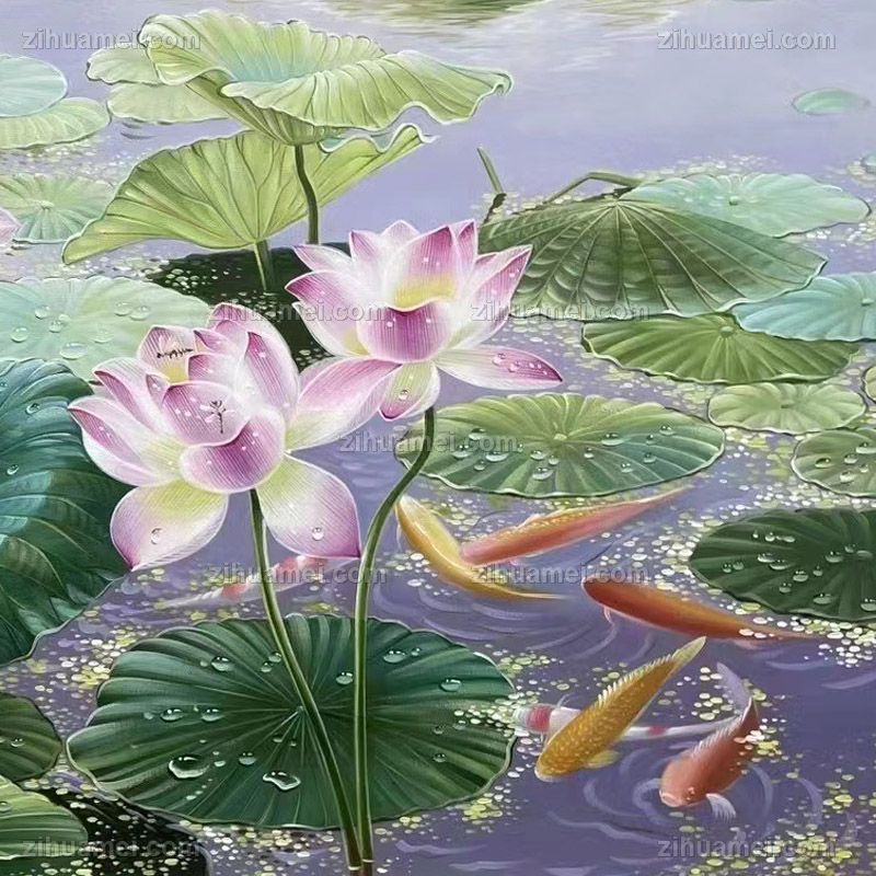 荷花锦鲤风景油画荷花池风景油画纯手绘油画 手绘