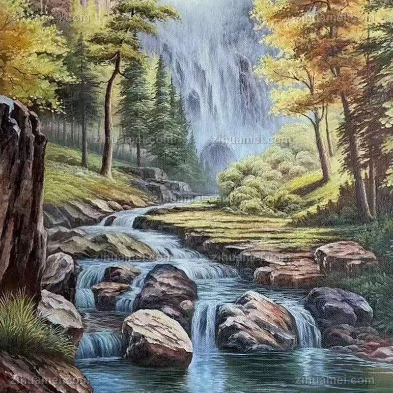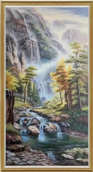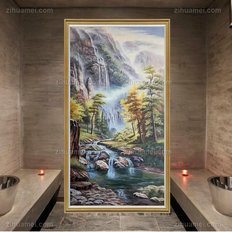 • 山川风景油画竖幅山水风景油画纯手绘写实山水画实木画框