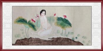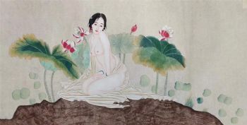 • 荷花美女图人体艺术手绘人物国画四尺工笔人物美女图裸体人物画