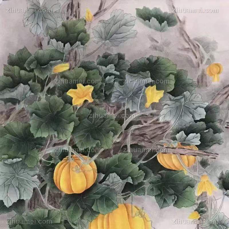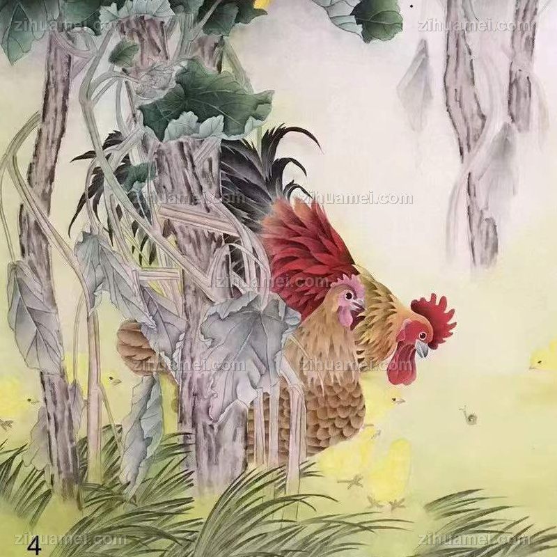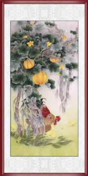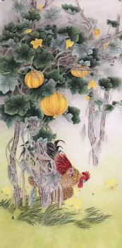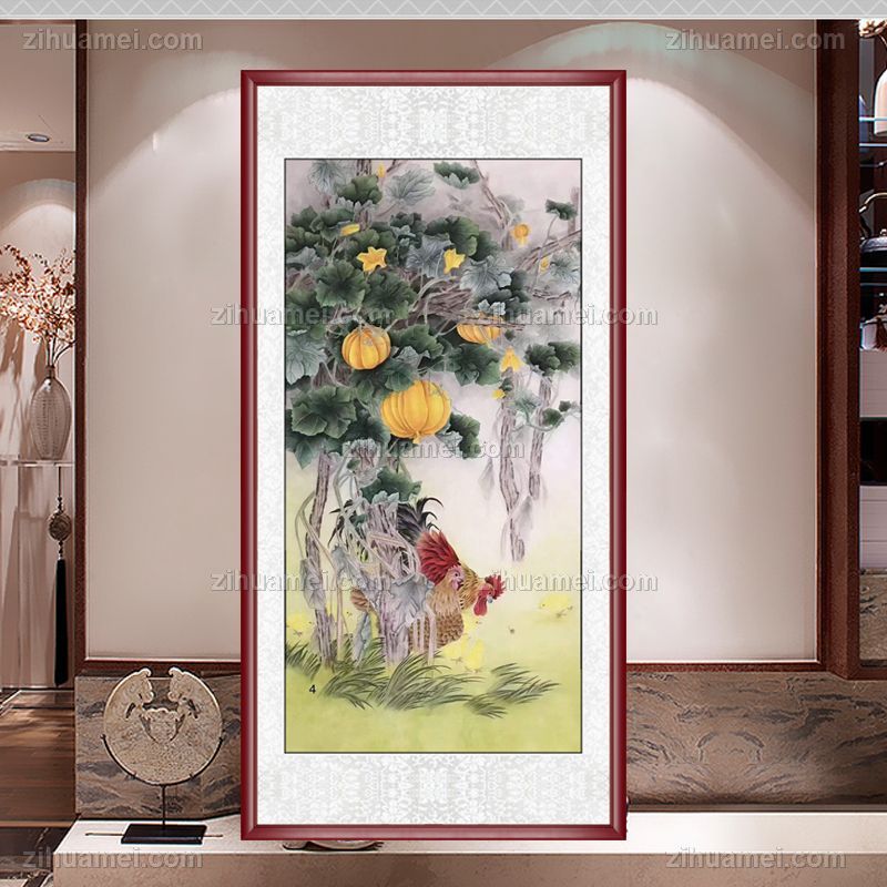 • 南瓜下的大公鸡适合走廊玄关的四尺工笔动物花鸟国画纯手绘水墨画
