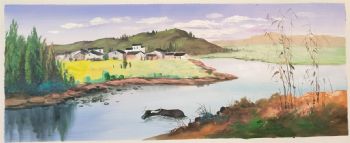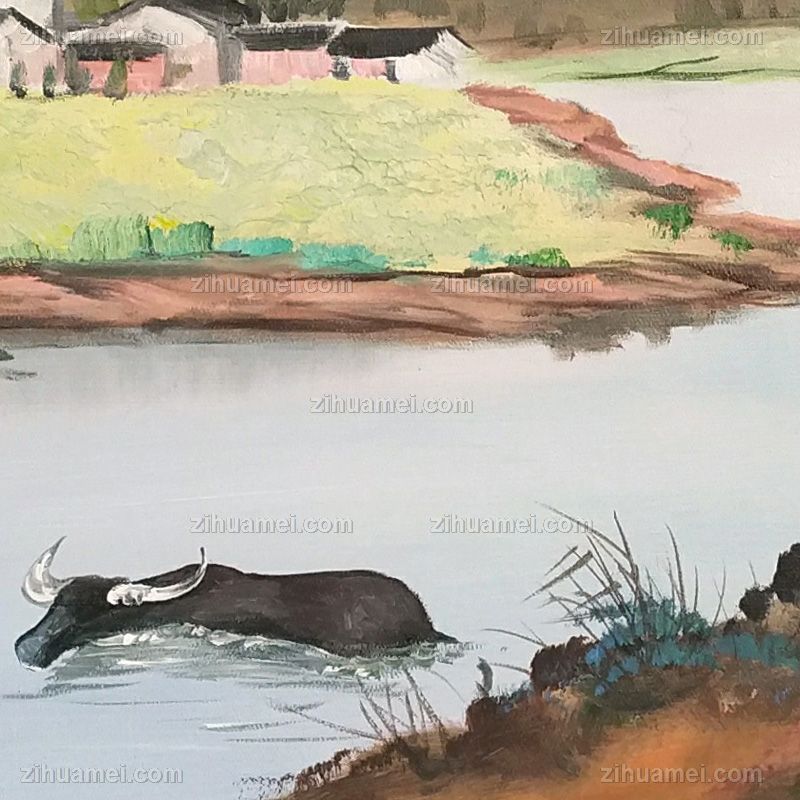 • 江南风景悠闲的水牛抽象写意纯手绘油画春天风景油画现代艺术画