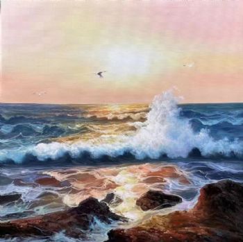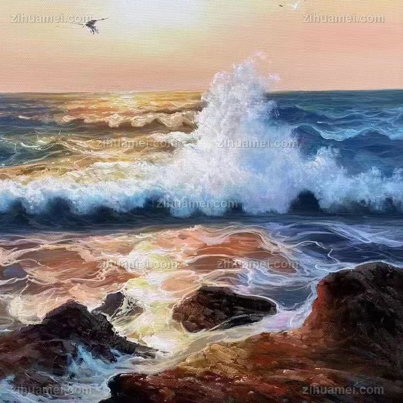 • 欧式风景油画纯手绘海浪风景画飞翔的海鸥精品油画实木画框