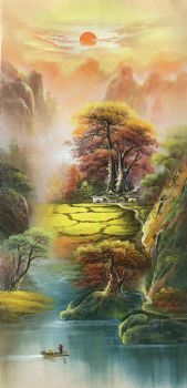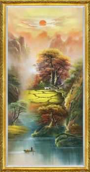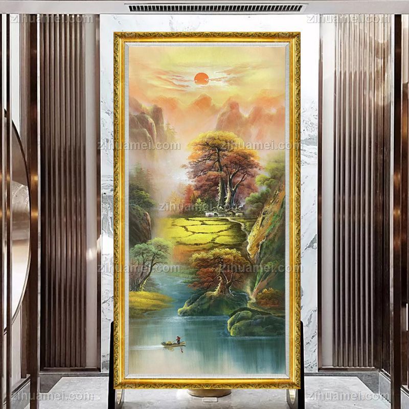 • 旭日东升高品质山水油画纯手绘新中式风水画聚宝盆实木画框