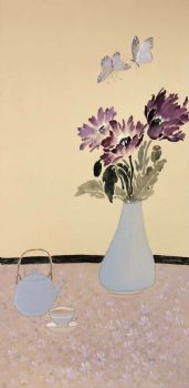 • 精品四尺四开水墨花鸟画纯手绘写意茶趣花瓶风景画原木画框