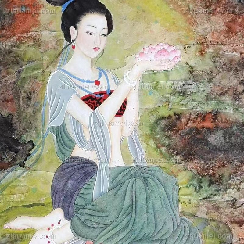 • 浓墨重彩水墨国画仕女图天女散花实力画家工笔人物画实木画框