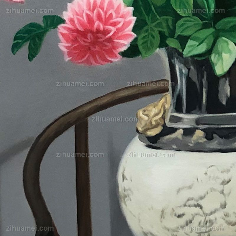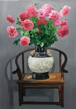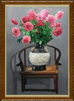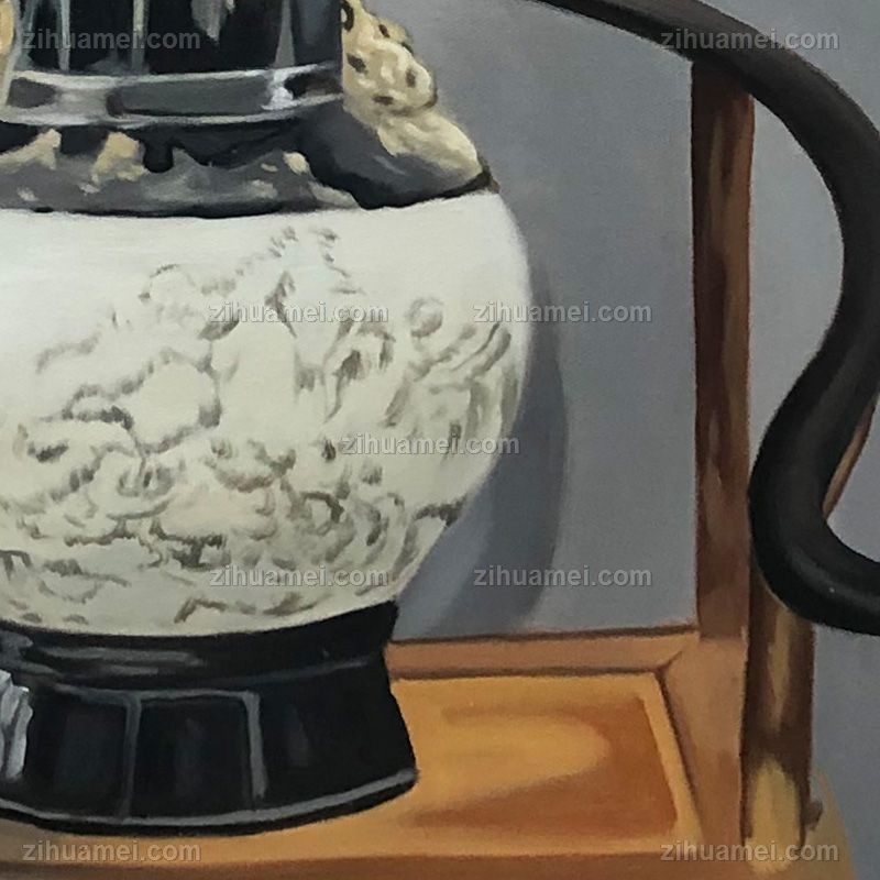 • 纯手绘写实花鸟油画花瓶与太师椅寓意富贵与权力新中式油画实木画框