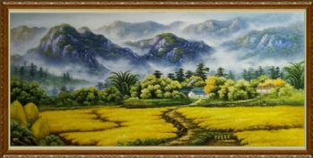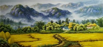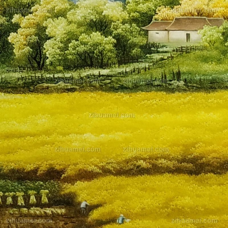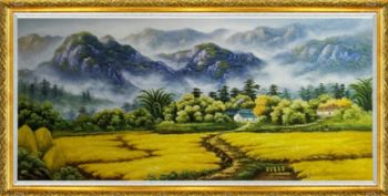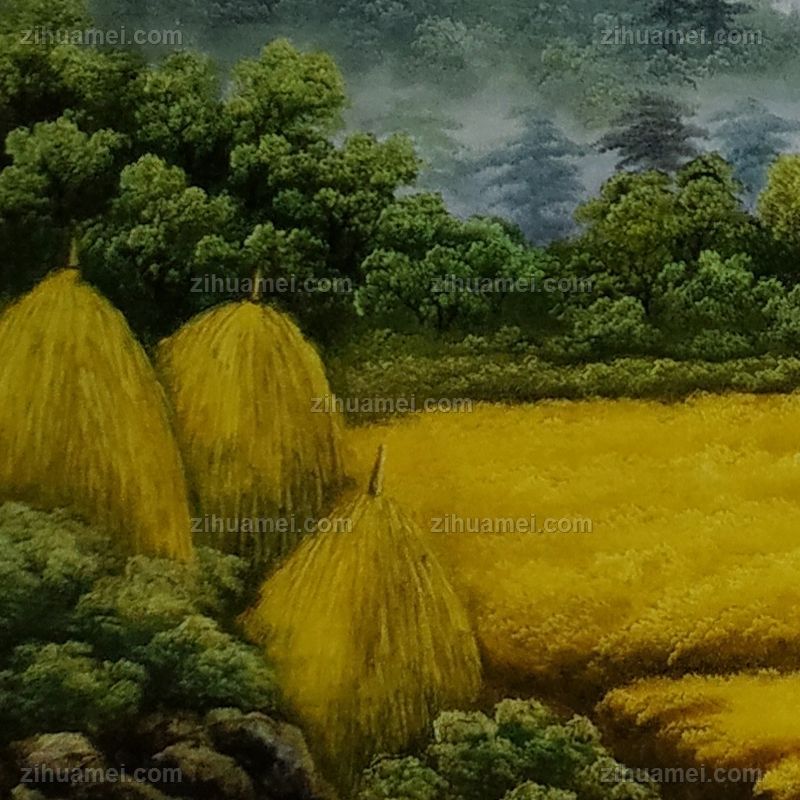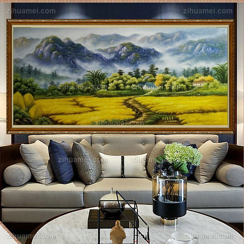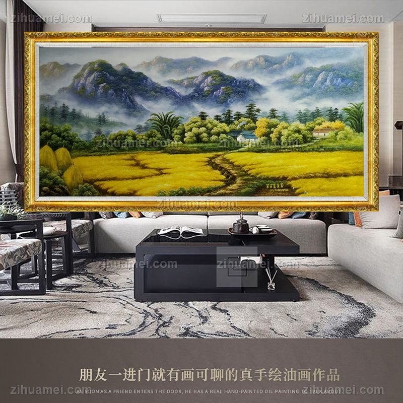 • 纯手绘油画黄金满地新中式丰收的季节风景油画背有靠山风水油画实木画框