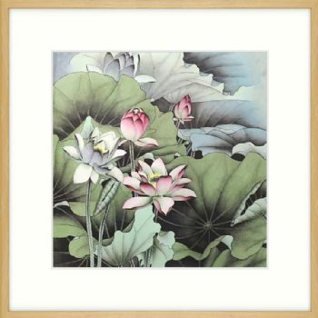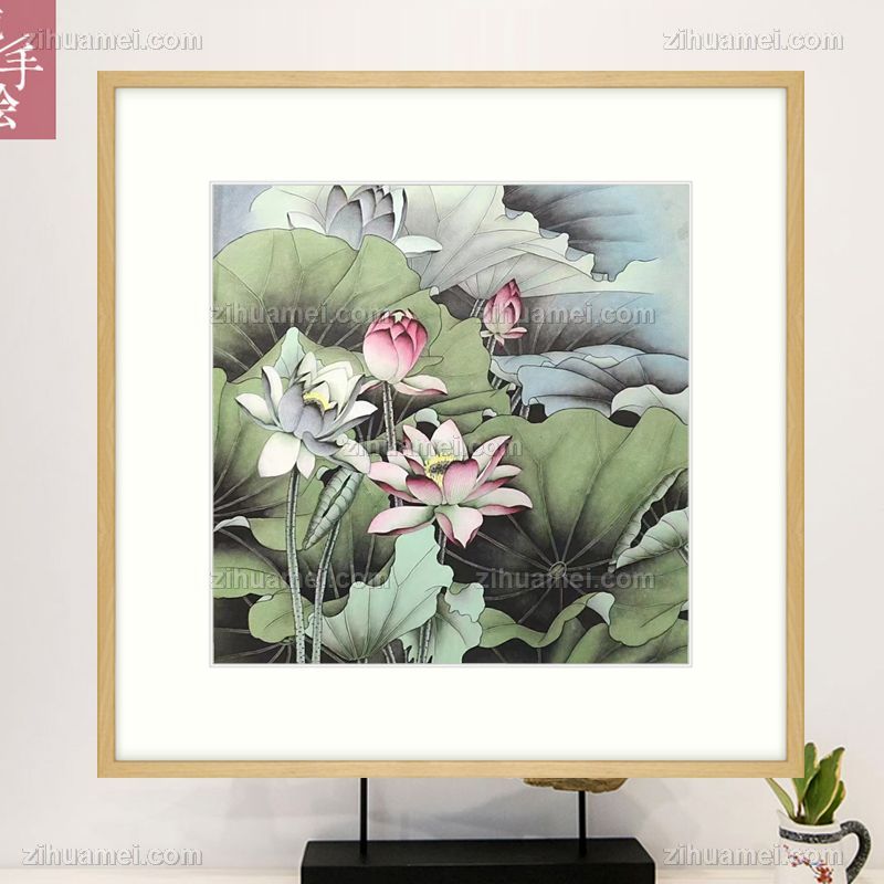 • 手绘水墨国画四尺斗方工笔国画荷花图原木色画框