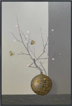 • 新中式蝶恋花纯手绘手工油画艺术作品金色裂纹古朴艺术画厚肌理油画