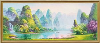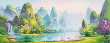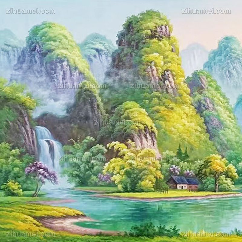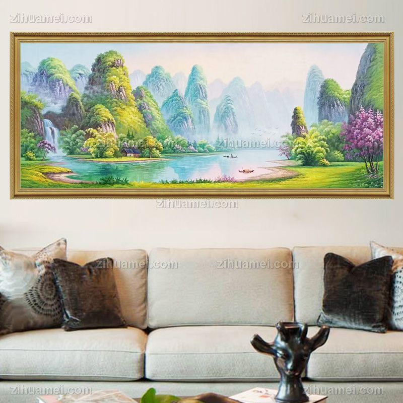 • 新中式山水油画 纯手绘风景画 风水画 青山绿水装饰画 实木画框