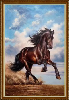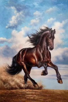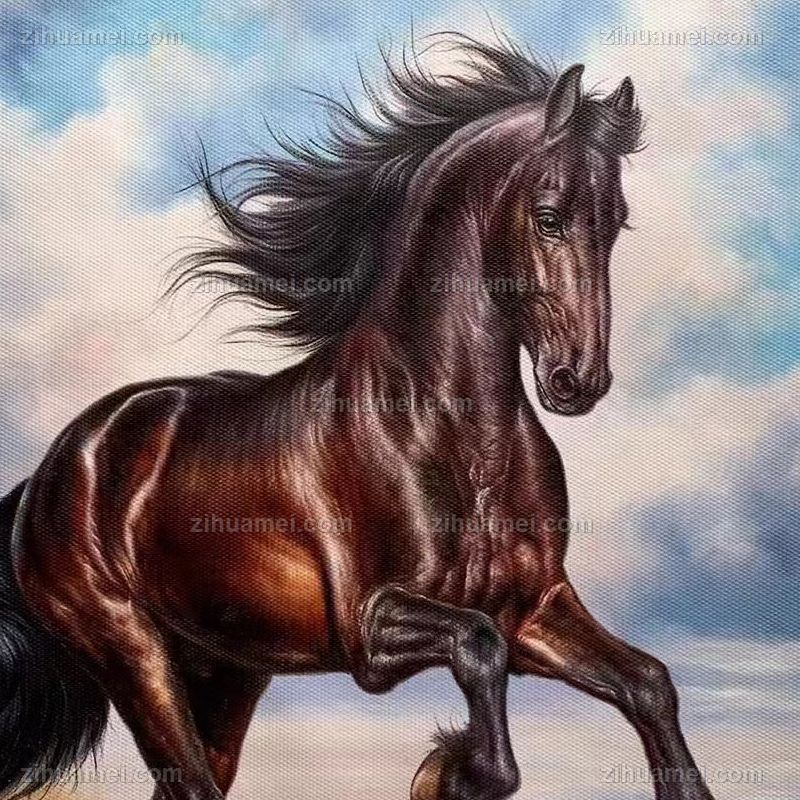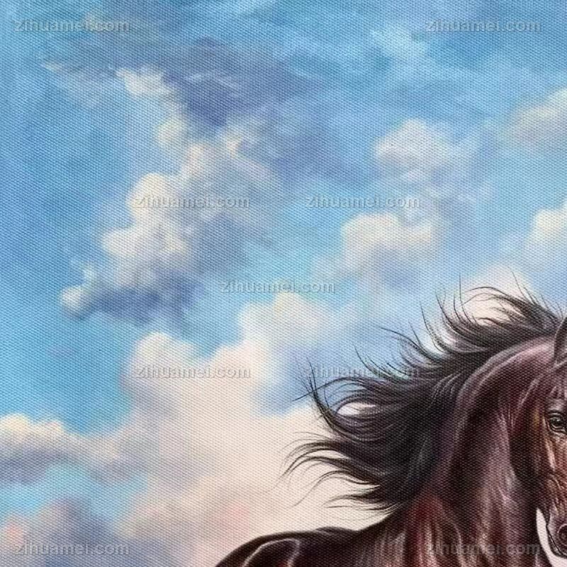 • 骏马系列白云下奔跑的黑马写实手绘油画实木画框