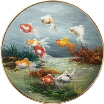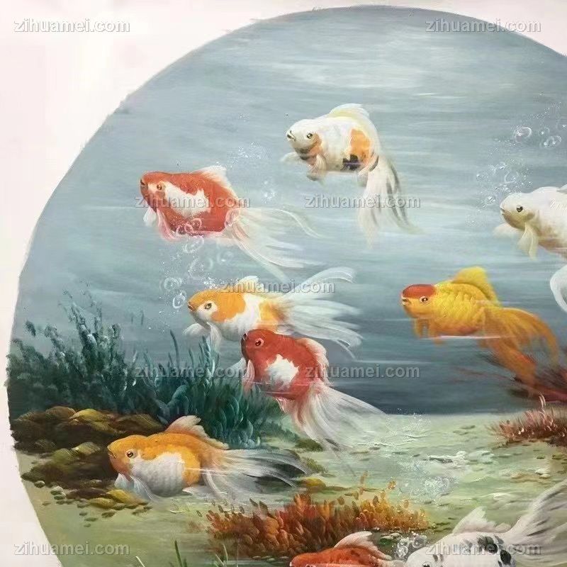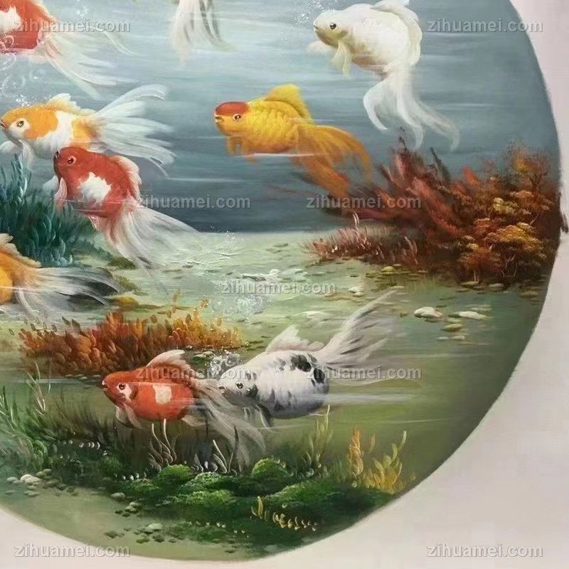 • 小写意新中式九鱼图纯手绘油画锦鲤图圆形油画